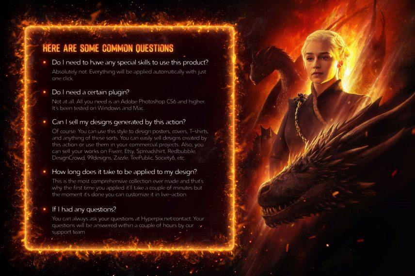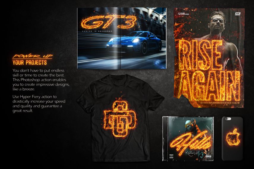 Set your text or logo or any shape on fire, with a single spark. Bring a realistic fire effect to your projects with this Photoshop action, without needing any skill. We have gathered the best effects ever, so you can use them in your projects and save yourself an enormous amount of time and energy.